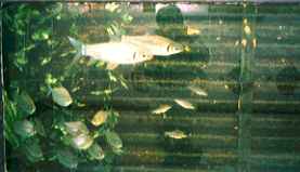 現在浅草湯の水槽の中で泳いでいるのは、このような比較的小さな魚達です。かつてはこぼれ話の「飼い魚に手をかまれる」にも書いたように、ピラルクーやアロワナといった巨大魚達が泳いでいたのですが、不幸な事故で失ってから、世話の楽な小さな魚達にしました。
