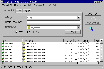 「*」はワイルドカードといってとりあえず、その拡張子 .bmp のすべてのファイルという意味です。逆にファイル名が同じで拡張子がバラバラなものを検索する場合は、「 OJIN.* 」のようにします。
